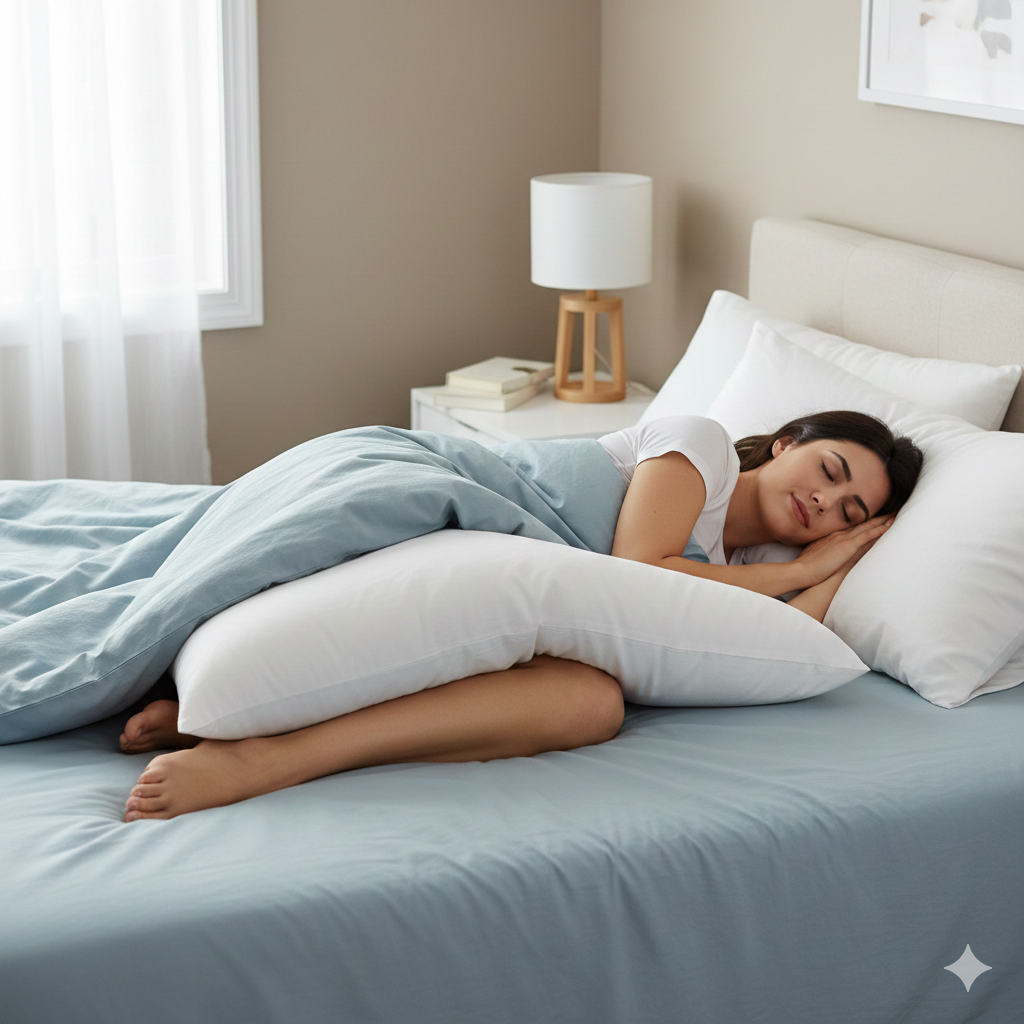 Réduction des douleurs de hanche : Si vous souffrez d’arthrose de la hanche ou de douleurs articulaires, mettre un coussin entre les jambes pour dormir évite le frottement direct entre vos genoux et soulage les points de pression.