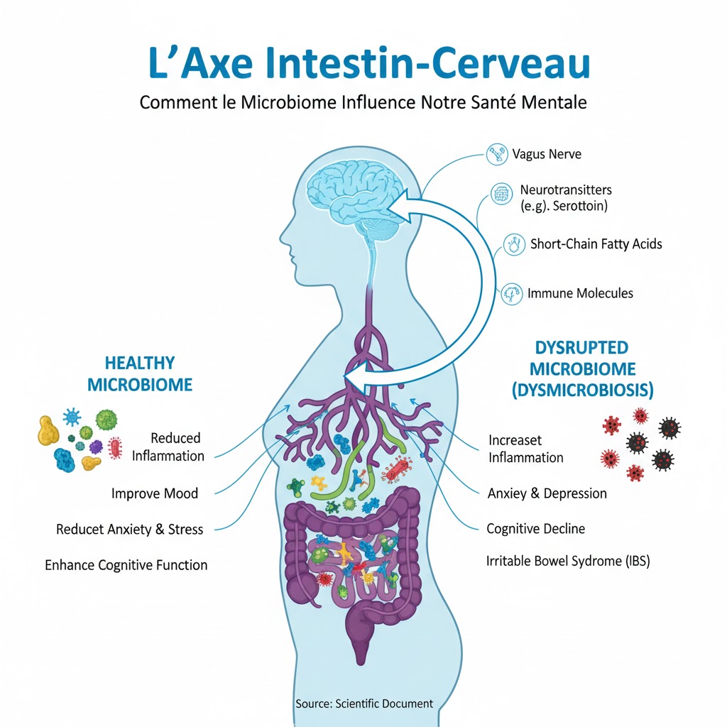 Dans un monde où les troubles anxieux et dépressifs touchent des centaines de millions de personnes, la recherche scientifique explore des pistes thérapeutiques innovantes. Parmi elles, l’étude de l’axe microbiome-intestin-cerveau révolutionne notre compréhension de la santé mentale. Loin d’être de simples organes de digestion, nos intestins abritent un écosystème complexe de 100 000 milliards de microorganismes qui dialoguent en permanence avec notre cerveau, influençant nos émotions, notre cognition et notre comportement.
